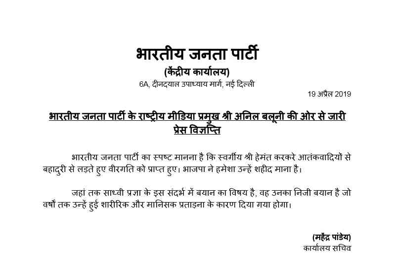 ભારતીય જનતા પાર્ટીએ નિવેદન જાહેર કરીને સાધ્વી પ્રજ્ઞા ઠાકુરના આ નિવેદનથી પોતાને અલગ કર્યું છે. પાર્ટીએ કહ્યું કે, ભારતીય જનતા પાર્ટીનું સ્પષ્ટ માનવું છે કે હેમંત કરકરે આતંકવાદીઓ સાથે બહાદુરીપૂર્વક લડી વીરગતિને પ્રાપ્ત થયા. આ તેમનું અંગત નિવેદન છે જે વર્ષ સુધી તેમને થયેલા શારિરીક અને માનસિક પીડાને કારણે આપવામાં આવ્યું હશે.