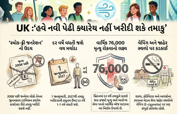 Smoke Free Generation: UKએ ધૂમ્રપાન મુક્ત પેઢી તૈયાર કરવાના ઉમદા હેતુથી એક ઐતિહાસિક અને અત્યંત કડક કાયદો પસાર કર્યો છે, જેના અંતર્ગત હવે વર્ષ 2008 પછી જન્મેલા લોકો તમાકુ કે સિગારેટ ખરીદી શકશે નહીં. બ્રિટિશ સંસદના બંને ગૃહમાં 'ટોબેકો એન્ડ વેપ્સ બિલ' પસાર થઈ ગયું છે અને કિંગ ચાર્લ્સ તૃતીયની ઔપચારિક મંજૂરી બાદ તે કાયદાનું સ્વરૂપ લેશે. આ કાયદો 1 જાન્યુઆરી, 2027થી સમગ્ર UK એટલે કે ઈંગ્લેન્ડ, સ્કોટલેન્ડ, વેલ્સ અને ઉત્તર આયર્લેન્ડમાં અમલી થઈ જશે. હવે પછી દર વર્ષે તમાકુ ખરીદવાની લઘુતમ વય મર્યાદામાં એક વર્ષનો વધારો કરાશે, જેથી ભવિષ્યની પેઢી આ વ્યસનથી કાયમ માટે દૂર રહે.